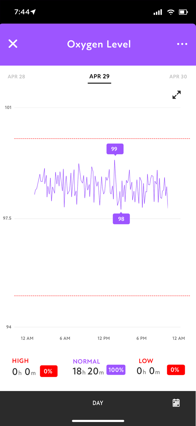 Oxygen levels represent the percentage of oxygen in your blood. It’s normal for an infant's oxygen levels to temporarily dip during everyday activities such as eating or even filling their diaper. A range of 92-100% blood oxygen can be perfectly normal, while levels below 92% can be irregular.