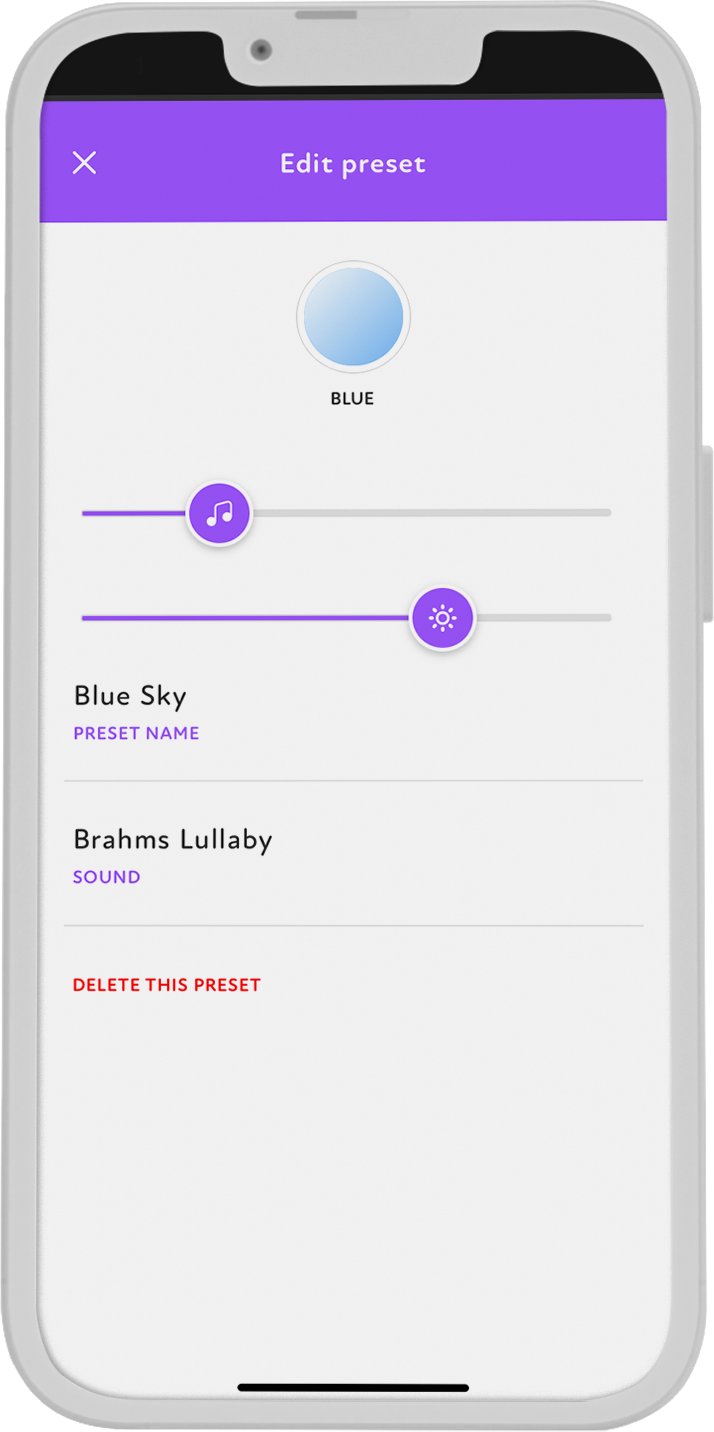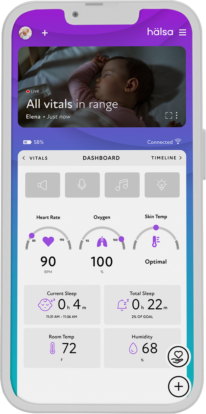 Use the Hälsa Baby App to play white noise or popular lullabies, set the night light, grant permissions for caregivers and activate travel mode. The Hälsa App lets you track their room environment conditions so you can make it comfortable and soothing and track wellness information so you can feel comfortable, too.