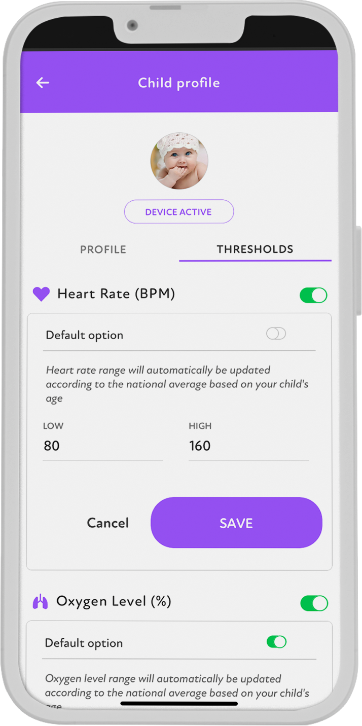 Set custom ranges based on your baby's needs and get a notification if something is out of range.